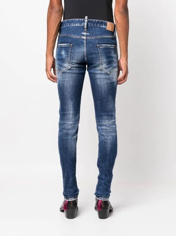 Quần jean vá logo hiệu ứng đau khổ của DSQUARED2 có màu xanh nhạt, cotton pha, hiệu ứng đau khổ, miếng vá logo ở phía trước, miếng vá logo ở phía sau, vòng thắt lưng, nút phía trước và khóa kéo, năm túi cổ điển và ống quần thẳng.