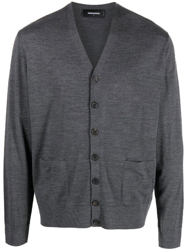 Áo len dệt kim cổ chữ V của DSQUARED2 có màu xám than, len nguyên chất, dệt kim mịn, cổ chữ V, cài cúc phía trước, tay áo dài và viền thẳng.
