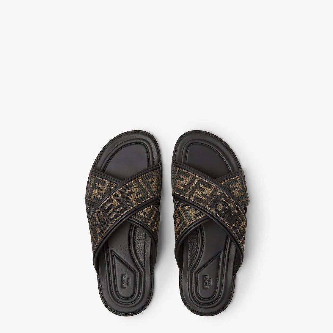 Dép quai chéo chun. Đế da và đế cao su. Làm từ da và cao su. Quai dép được thiết kế riêng với họa tiết macro FF màu nâu và đen.